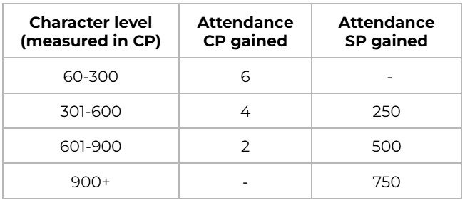 You will get the standard points for attending the event (CP and/or Service Points) in accordance with your character level (refer to the table on this page). Those CP will also be banked.